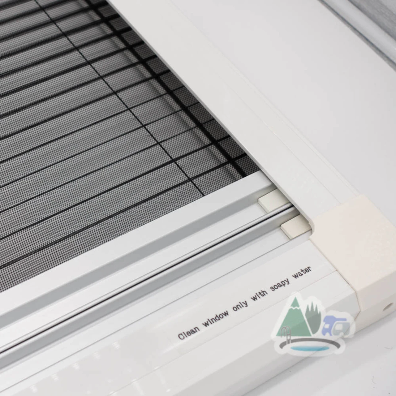 The inner frame features two integrated blinds – both a fly screen and a full blind. The fly screen is made of a fiberglass mesh, giving it a rugged durability and allowing ventilation. The full blind has a reflective rear to keep your camper-van, caravan or motor home insulated. You can also mix-and-match your use of these top hinge blinds, with magnets allowing them to hold position in the middle, and black tensioning screws allowing you to easily adjust tension at the top.