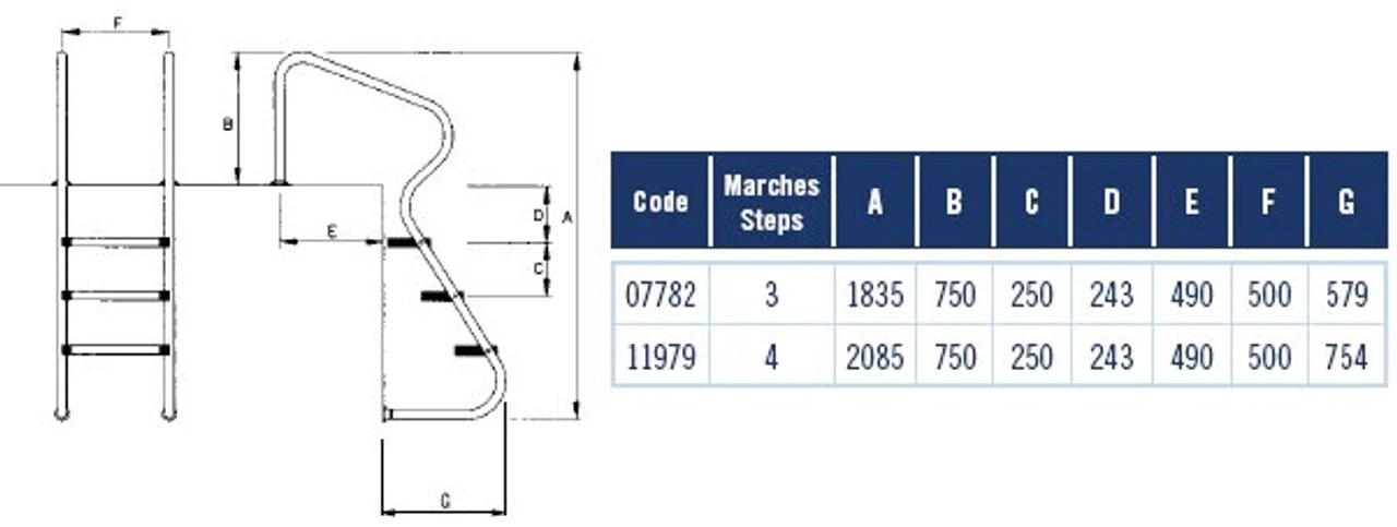The Astral Easy Access Swimming Pool Ladder has a width of 500mm and features hand polished stainless steel handrails (of Ø 43mm).