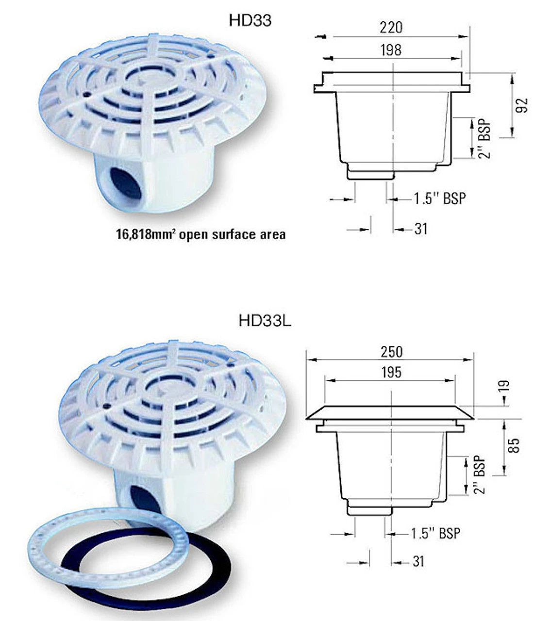 The anti vortex pool main drain is available individualy or as a kit set out in the table below:-