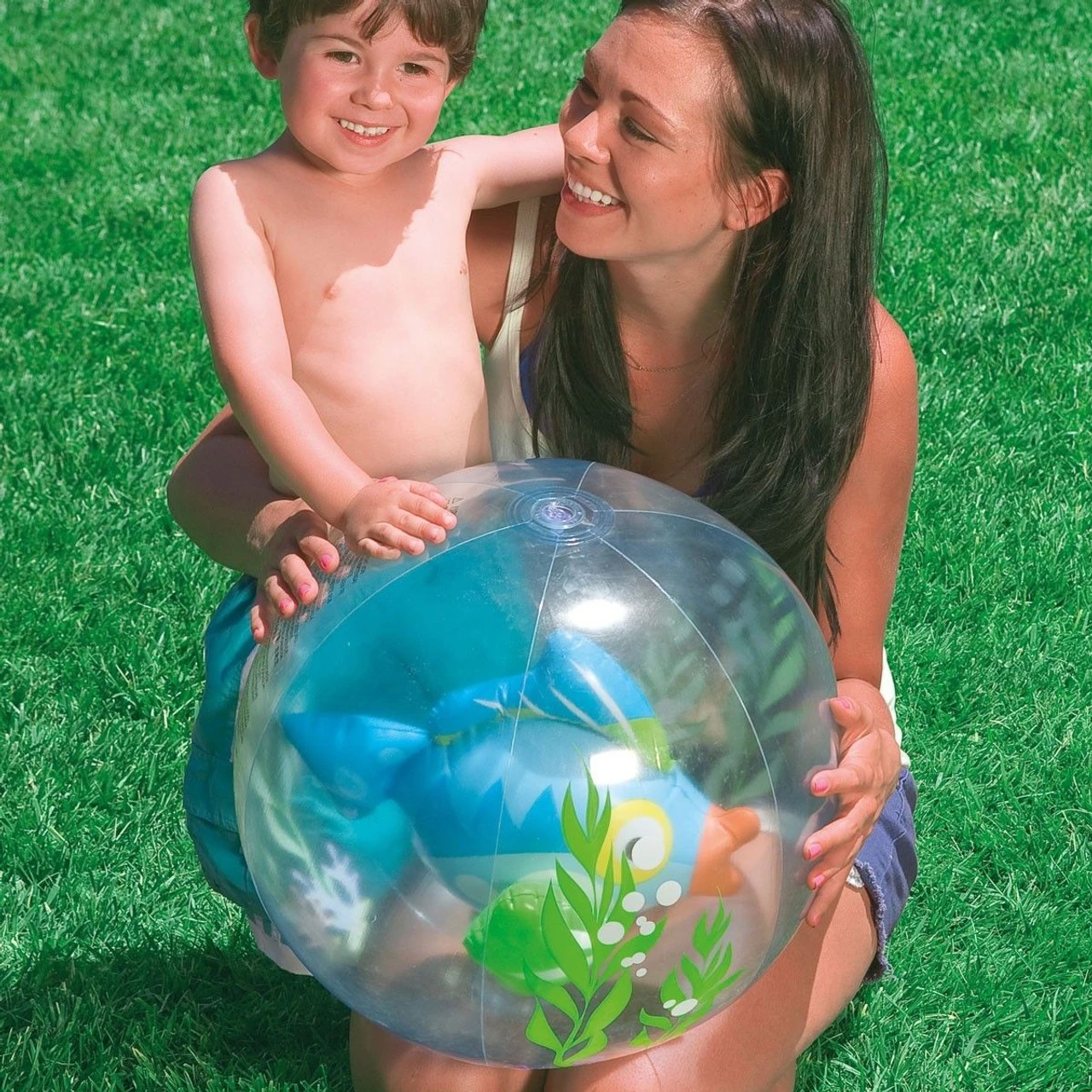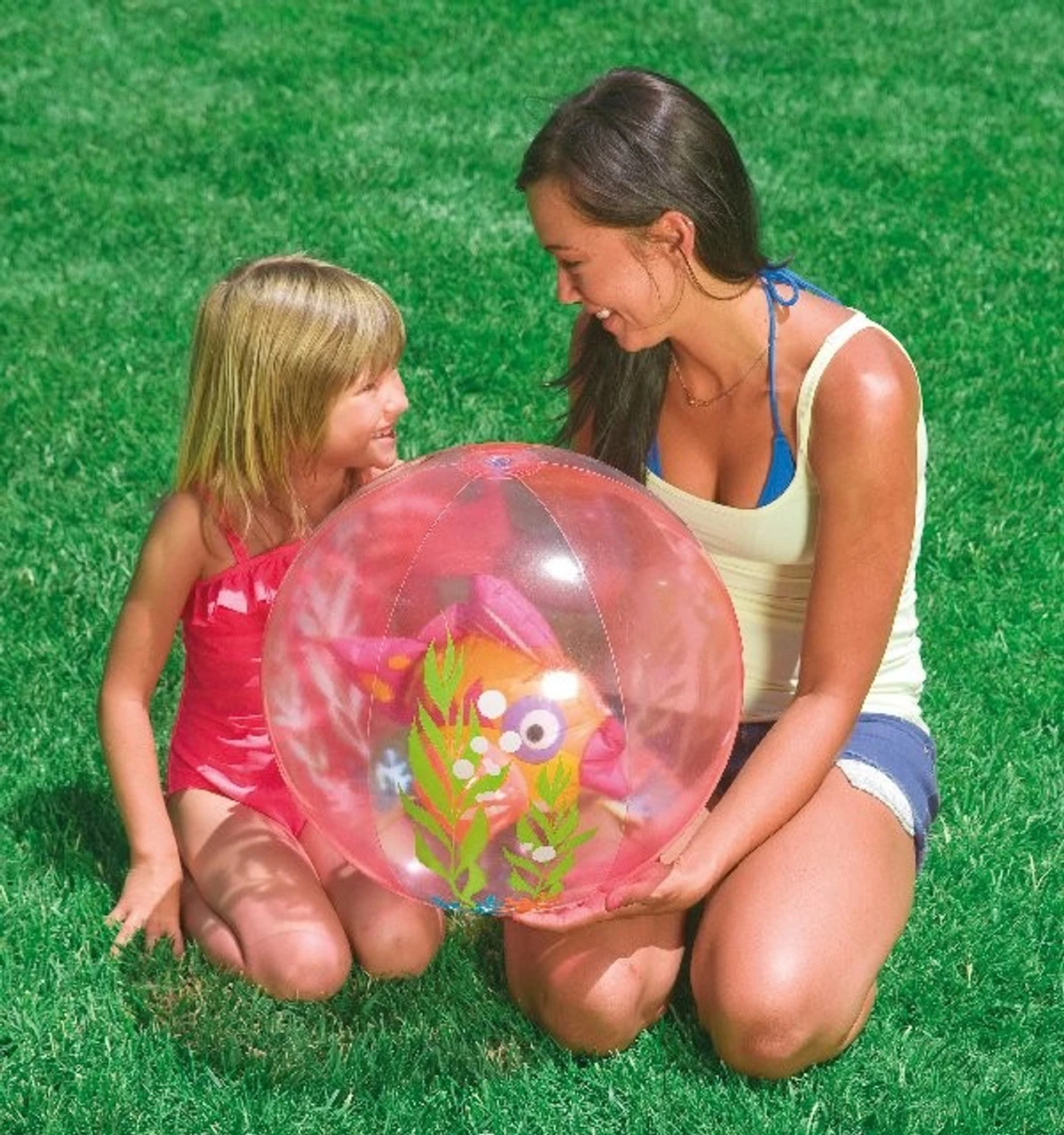 It’s a fishy beach ball in either pink or blue, complete with fish inside. 24″ diameter