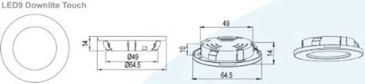 A chic and slim recessed down light, the LED9 2w Touch Downlite Light for Caravans, Campervans and Motorhomes can be switched on or off by a simple touch of the illuminated button in the centre of the light lens.