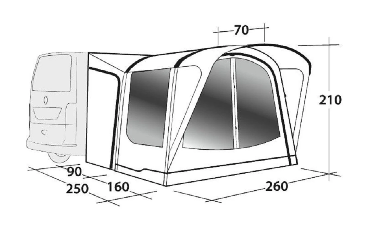 Outwell Newburg 160 drive away awning is designed for use with VW, Ford Transit and similar sized campervans. This easy and quick to pitch drive away awning features a spacious living area ideal for additional living space or storage during camping trips and holidays. The Outwell Newburg 160 drive-away awning is a tunnel tent style awning with a central inside pole along the roof line, side access via doors at the front and back of your campervan and has a height range of 175cm-200cm via beading options (5mm and 7mm).Â