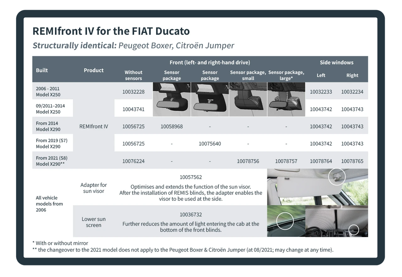 The Remis Remifront cab blinds are designed especially for the Fiat Ducato, Peugeot Boxer, Citroen Relay, and Citroen Jumper motorhomes and campervans,