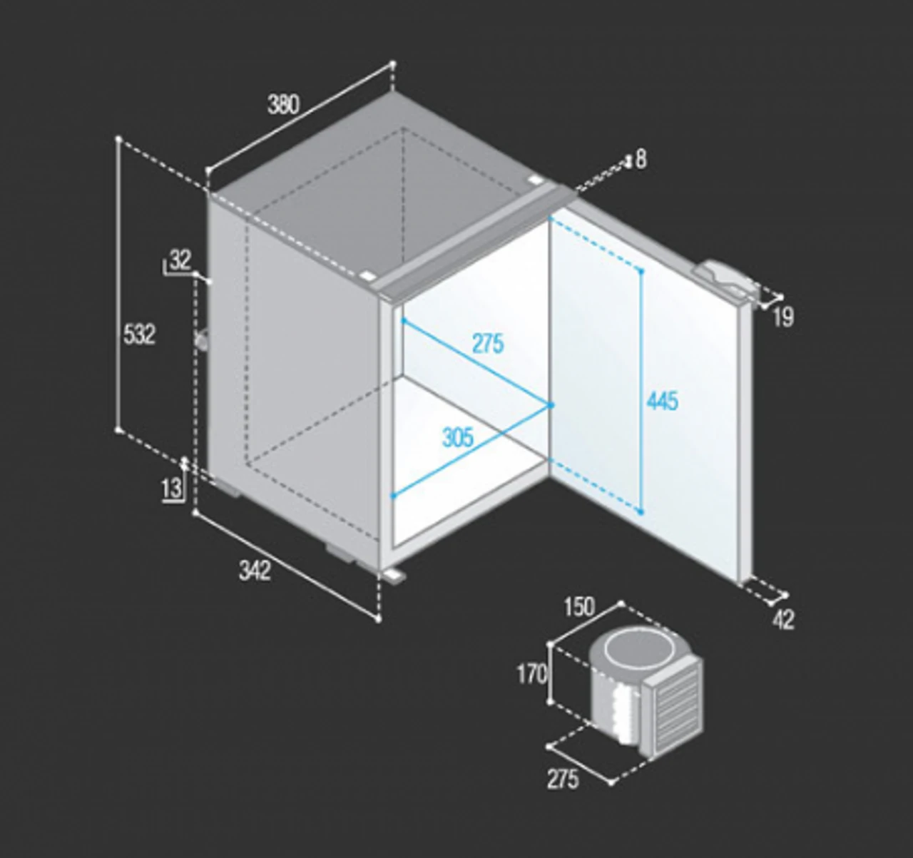 - Supplied with externally mounted Danfoss BD35 12/24V compressor and cooling unit maximising available space in the fridge